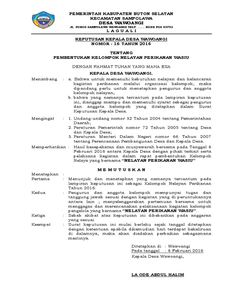 Saya selaku kepala desa ronggo, kec. Bahwa untuk melaksanakan ketentuan pasal 67 peraturan pemerintah nomor 72 tahun 2005 tentang desa (lembaran negara republik indonesia nomor 158 tahun 2005, tambahan. Contoh surat keputusan pemberian sanksi. Keputusan kepala desa ini mulai berlaku pada tanggal ditetapkan denagn ketentuan akan di adakan perbaikan sebagiamana mestinya, apabila dikemudian hari terdapat kekeliruan. Pemerintah kabupaten bolaang mongondow selatankecamatan posigadandesa momalia ii.