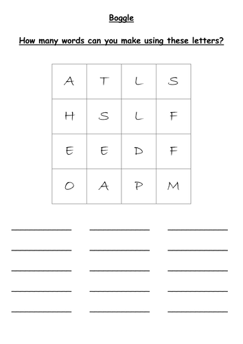 Boggle Word Games Teaching Resources from dryuc24b85zbr.cloudfront.net Your child will probably now be starting to read independently, but games and activities are still a fun way to help with phonic skills, word recognition and general language development. Shop cookware and mobile phones online, and browse key pieces of f&f clothing, available in selected stores. Explore our selected online non food range at tesco. Jan 26, 2017 · here's a quick roundup of some of the best word games this side of countdown, boggle and scrabble. Learn how to make a simple crossword puzzle for kids with this blank crossword template. this crossword sheet is customisable and an easy way to personalise and create engaging lessons for your class.the document is a single a4 sheet that has an editable crossword template for kids with space for 15 different words to find.the crossword template can be easily edited by filling out the. The longer the word, the more points are awarded.this is a fantastic way to help children improve their vocabulary, grammar, spelling and plenty of other. This literacy game sees you push word barrels around into the correct category of either proper nouns, common nouns, adjectives or comparative adjectives in order to escape from the forbidden chamber.